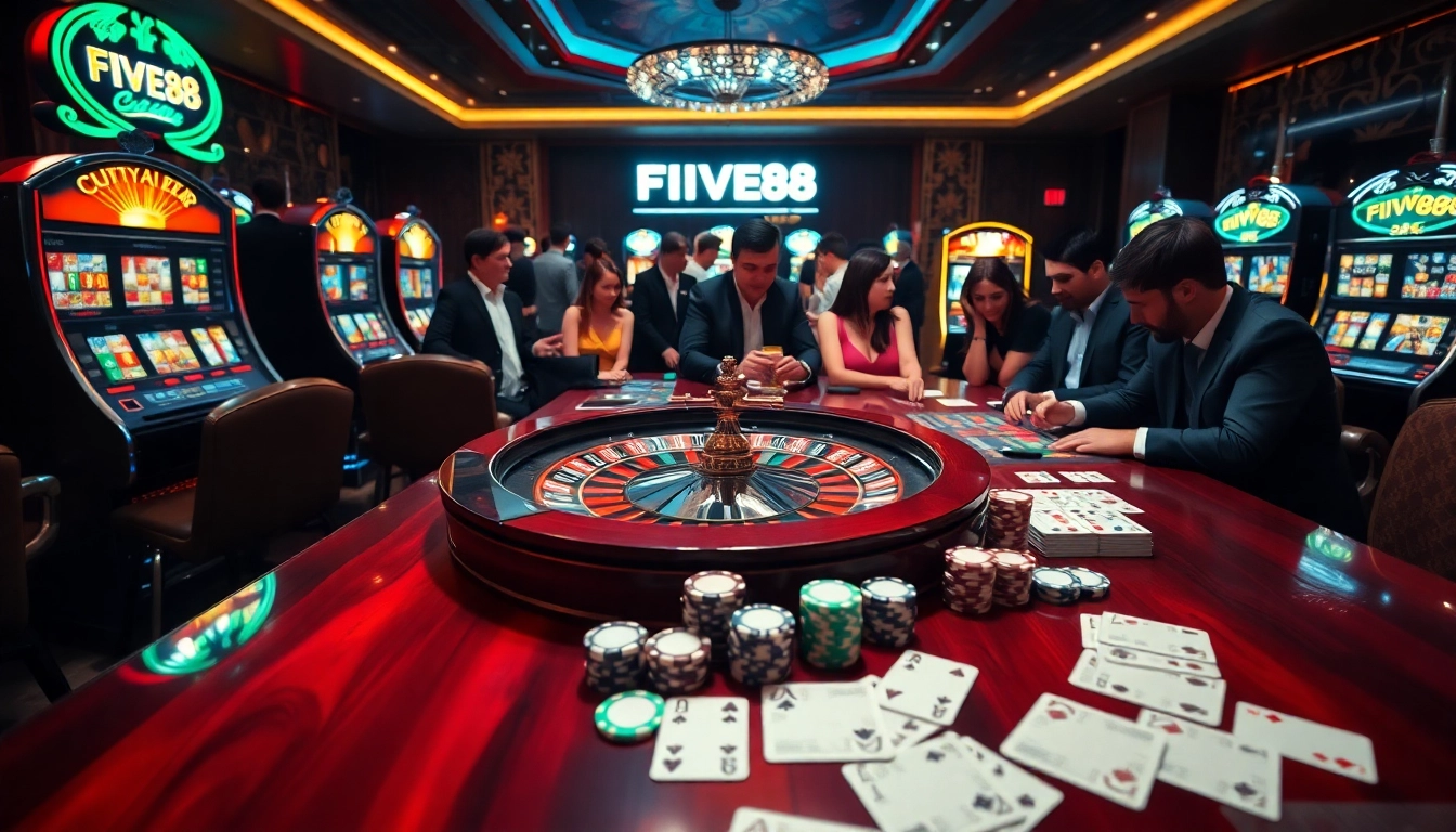 Enhance your gambling experience at FIVE88 with a vibrant casino scene featuring roulette and poker.