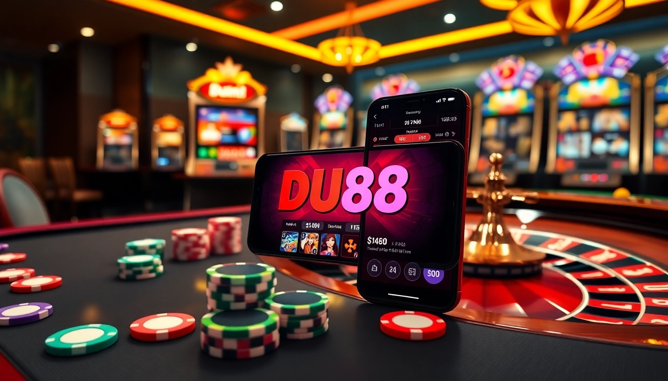 Experience the excitement of online gambling with DU88's vibrant casino atmosphere, featuring poker chips and roulette wheels.